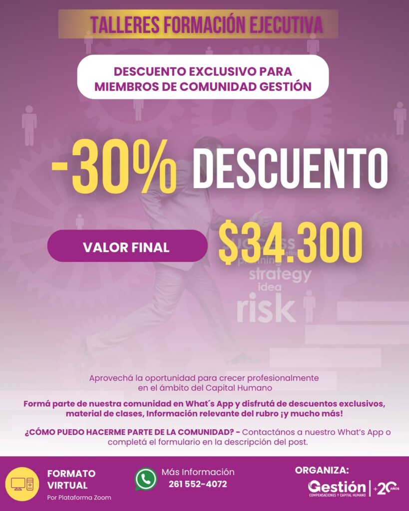 Capacitaciones de formación ejecutiva en capital humano Talleres Descubrí oportunidades de impulsar tu crecimiento profesional. Quiero capacitarme Próximos talleres Estrategias de marca empleadora - Finalizado Modalidad: Virtual Cantidad: – A quién está dirigido: Fecha y Horario: 23/09 – 25/09 – De 10:00 AM a 12:00AM ARG Beneficios: Conocé cómo obtener el mayor compromiso de los equipos de trabajo Quiero inscribirme