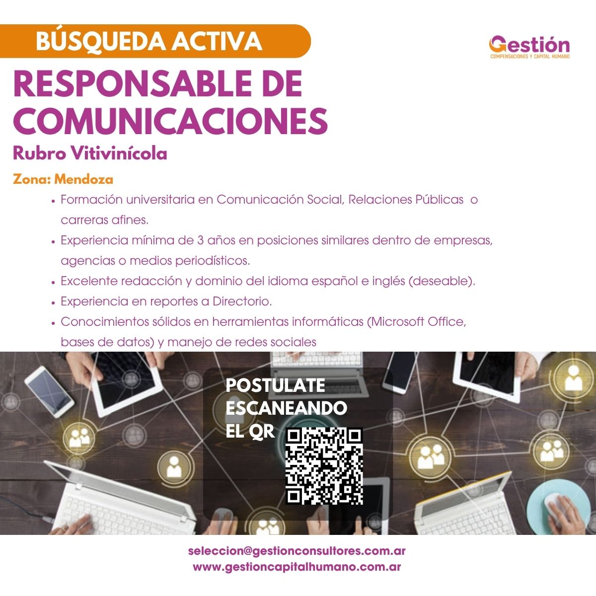 - Formación universitaria en comunicación social, relaciones públicas o carreras afines.